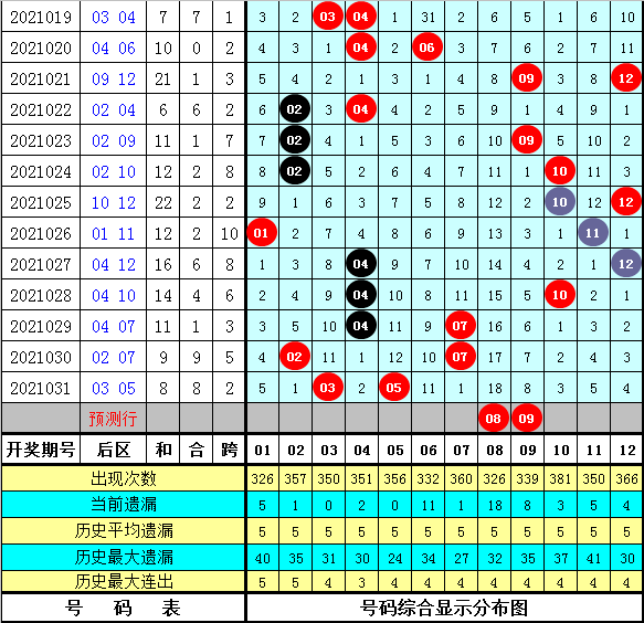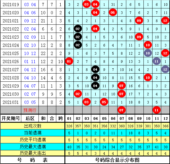 前区温码判断:在大乐透第2021031期开奖之后,前区目前有14个遗漏值4-9之间的温码,温码遗漏分布为:号码09 21 22 30遗漏值为4期、号码07 11 24 27遗漏值为5期、号码31遗漏值为6期、号码14遗漏值为7期、号码13 16遗漏值为8期、号码12遗漏值为9期。