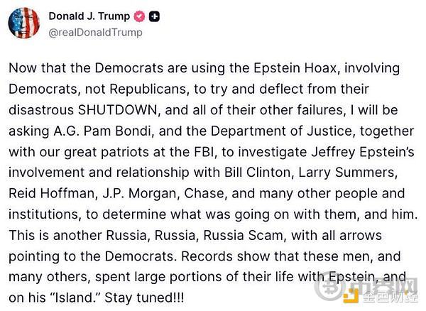 一场金钱权力斗争正在众目睽睽之下爆发——但几乎没有人意识到其中的利害关系。以下是我个人的推测。 过去几个月,ZZ、市场和媒体领域都出现了一种新的模式。零散的新闻标题突然联系起来,市场异常现象看起来不再那么偶然,机构行为也表现出异乎寻常的激进。表面之下,似乎隐藏着更深层次的变革。 这不是正常的货币周期。 这并非传统意义上的党派之争。 这不是“市场波动”。 我们现在目睹的是两种相互竞争的货币体系之间的直接对抗: 旧秩序……以摩根大通、华尔街和美联储为中心。 而新的秩序……以国债、稳定币和以比特币为基础的数字架构为中心。 这场冲突不再是纸上谈兵,而是真实存在的,并且正在加剧。几十年来,它首次公开化。 以下是对真实战场的一次尝试……大多数分析人士看不到的战场,因为他们仍然将 1970-2010 年的框架应用于一个正在挣脱自身束缚的世界。 一、摩根大通走出幕后大多数人认为摩根大通是一家银行。这是错误的。 摩根大通是全球金融机构的运营部门……它是最接近美联储核心机制的实体,影响着全球美元结算,并充当着传统货币体系的主要执行者。 所以,当特朗普发布关于爱泼斯坦关系网的内容,并明确点名摩根大通(而不是孤立地看待个人)时,这并非修辞上的夸张。他将体制内根深蒂固的机构拉进了这场舆论风暴。 同时: 这一切都不正常。 这一切都是同一个故事的一部分。 二、ZF悄然转向:将货币政策权力归还财政部媒体热衷于文化战争的转移视线,而真正的战略议程却是金钱。 本届ZF正悄然努力将货币发行中心拉回美国财政部……具体手段包括: 与国债整合的稳定币 可编程结算轨道 比特币储备作为长期抵押品 9 t: b; K) p6 o1 n