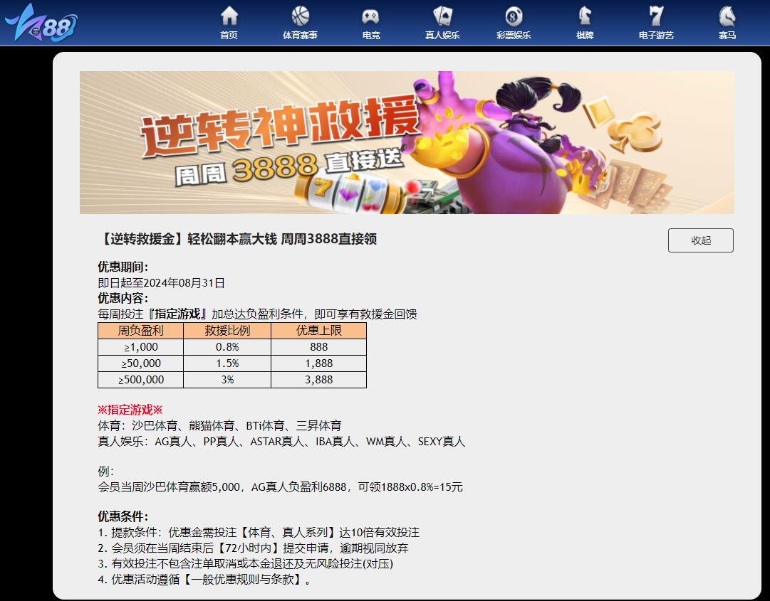 这个活动的前提也是输钱啊,每周投注『指定游戏』加总达负盈利条件,即可享有救援金回馈,最高是可以拿到3888的了,假如运气不好的话,那么也是一种重新崛起的方法啊。* W; |* K$ l5 R" S. x