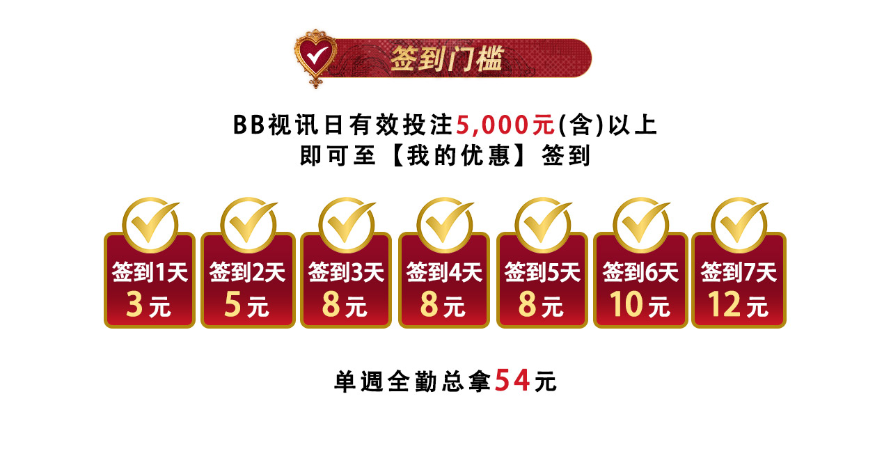 ! ^$ k+ [3 Y$ v  I- U' oBB视讯日有效投注5,000元(含)以上,前往【会员中心】→【优惠中心】→【我的优惠】→【签到送】,点击【签到】即可签到成功!